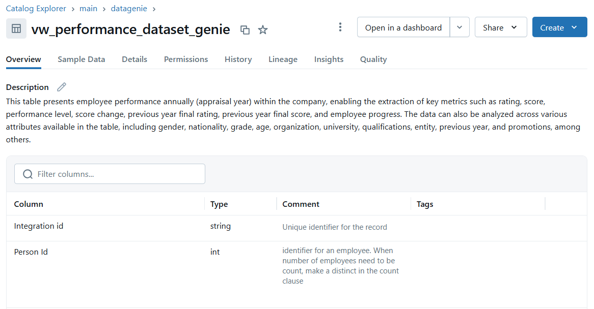 AI always appreciates a little guidance, so adding descriptions to each table and column in the space provides crucial context clues, helping Genie to interpret what the data represents and how it can be used. For example, instead of just naming a column «Value«, we can describe it as «Monthly revenue for each product category». The more informative the metadata is, the better Genie becomes at understanding the data.
