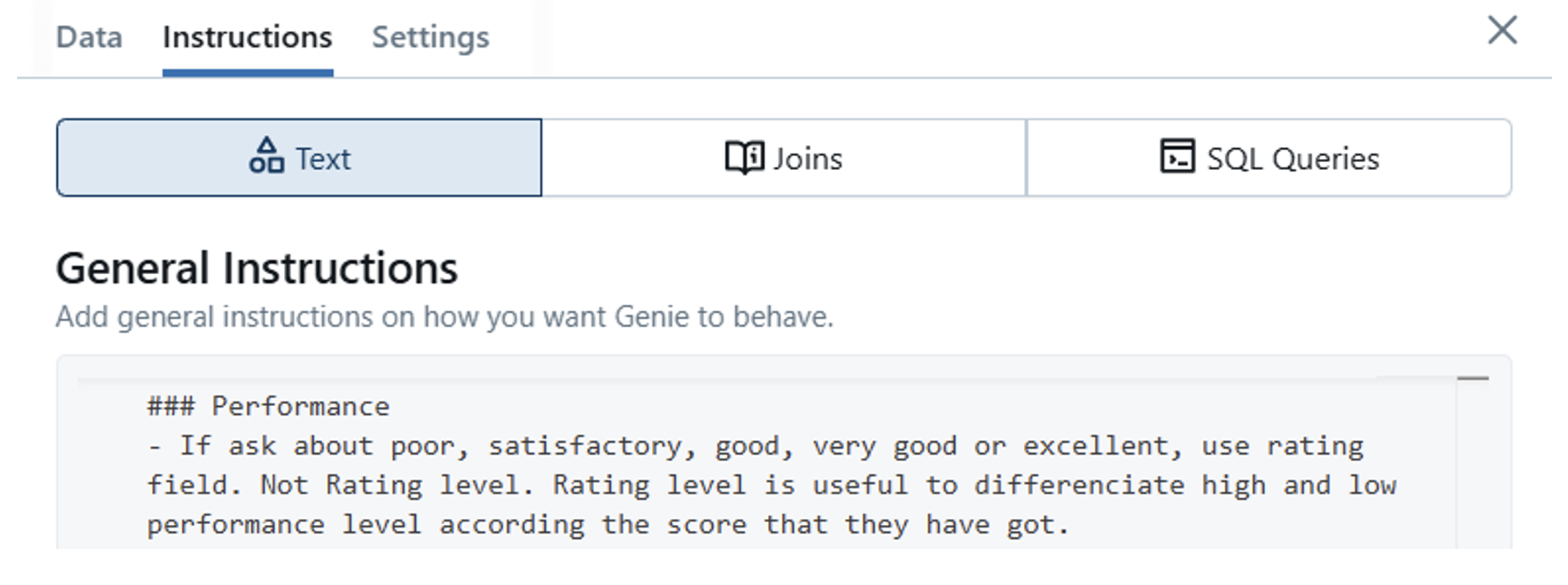 We can also provide custom instructions that guide Genie on how to interpret and relate data. These might define relationships between tables (e.g., “join sales with products on product_id”), preferred formats for answers (e.g., «show results in descending order of revenue»), or business logic rules (e.g., “exclude test users from analytics”). This can significantly enhance the quality and precision of Genie’s responses, especially when working with complex datasets: