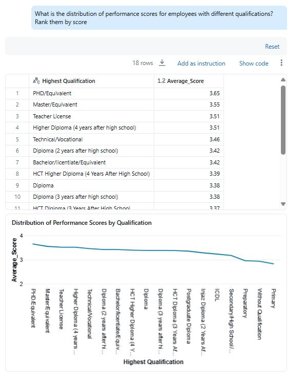 Or we fine-tune the structure of the question for better precision. For example, «Can you give me the number of students who have enrolled since 2022 by age group? How many of these are local vs. international?» becomes «Can you give me the number of students who have enrolled since 2022 by age group, with a breakdown of local vs. international students for each group?»