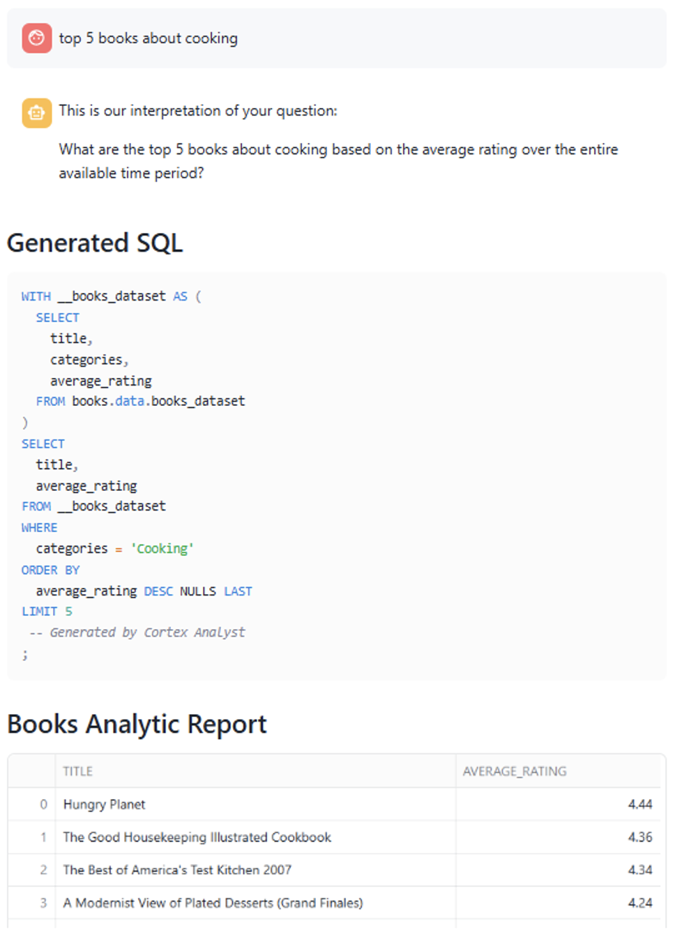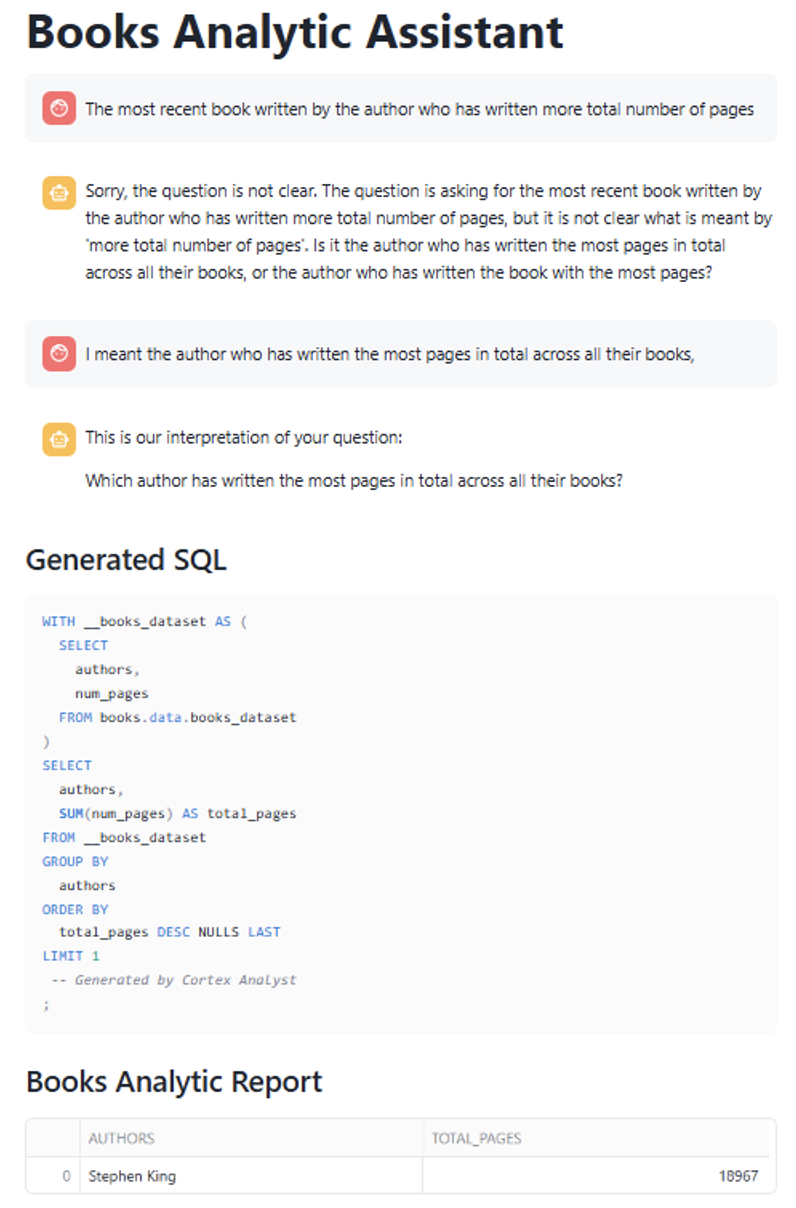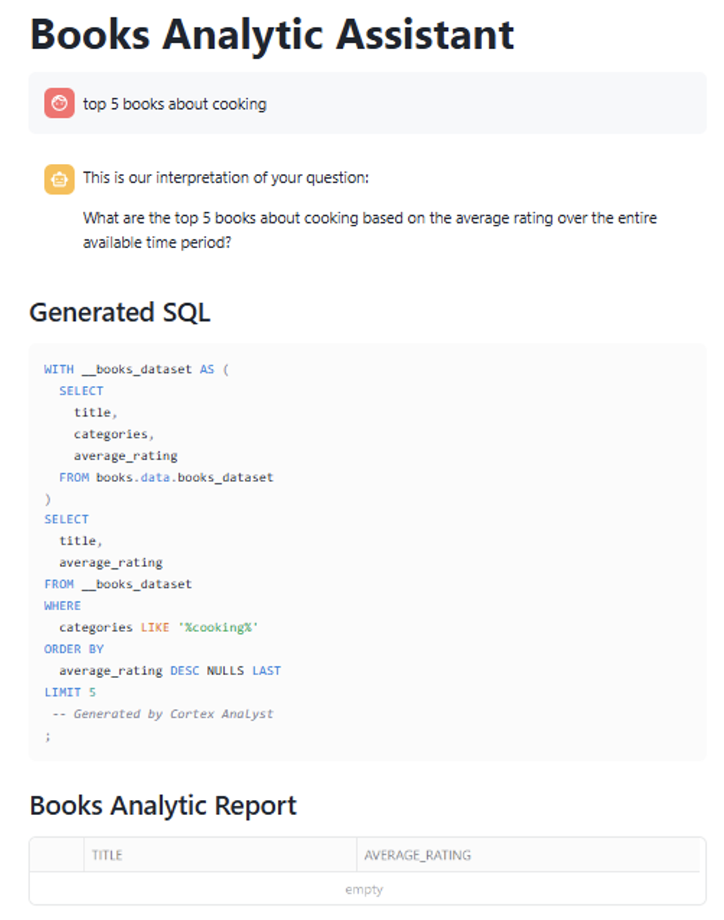 - Books Search Analyst: Based on Cortex Analyst, this app will use the engine to generate SQL queries from natural language.