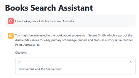 As we can see, the app suggests a book that could meet our requirements and even gives us its citation. With a normal SQL query, it would have been nearly impossible to find this book as the title does not mention Australia, so we’d have had to run an elaborate full-text search across the synopsis. However, this app uses an LLM to understand the description and returns a much more relevant match.