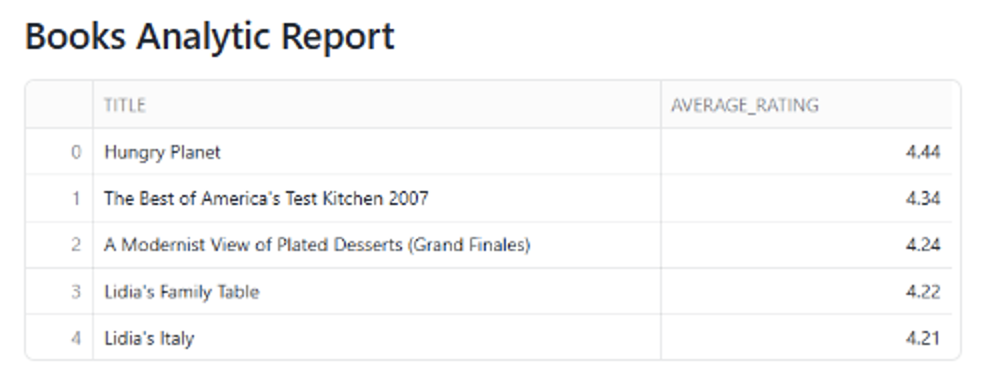 This time the app understands that “bestseller” means a highly rated title and recommends a book about dragons. Although The Wheel of Time doesn’t mention dragons in its name, Cortex Search’s semantic layer still surfaces it in seconds, something that would have required a far more elaborate full-text SQL query in a traditional setup.